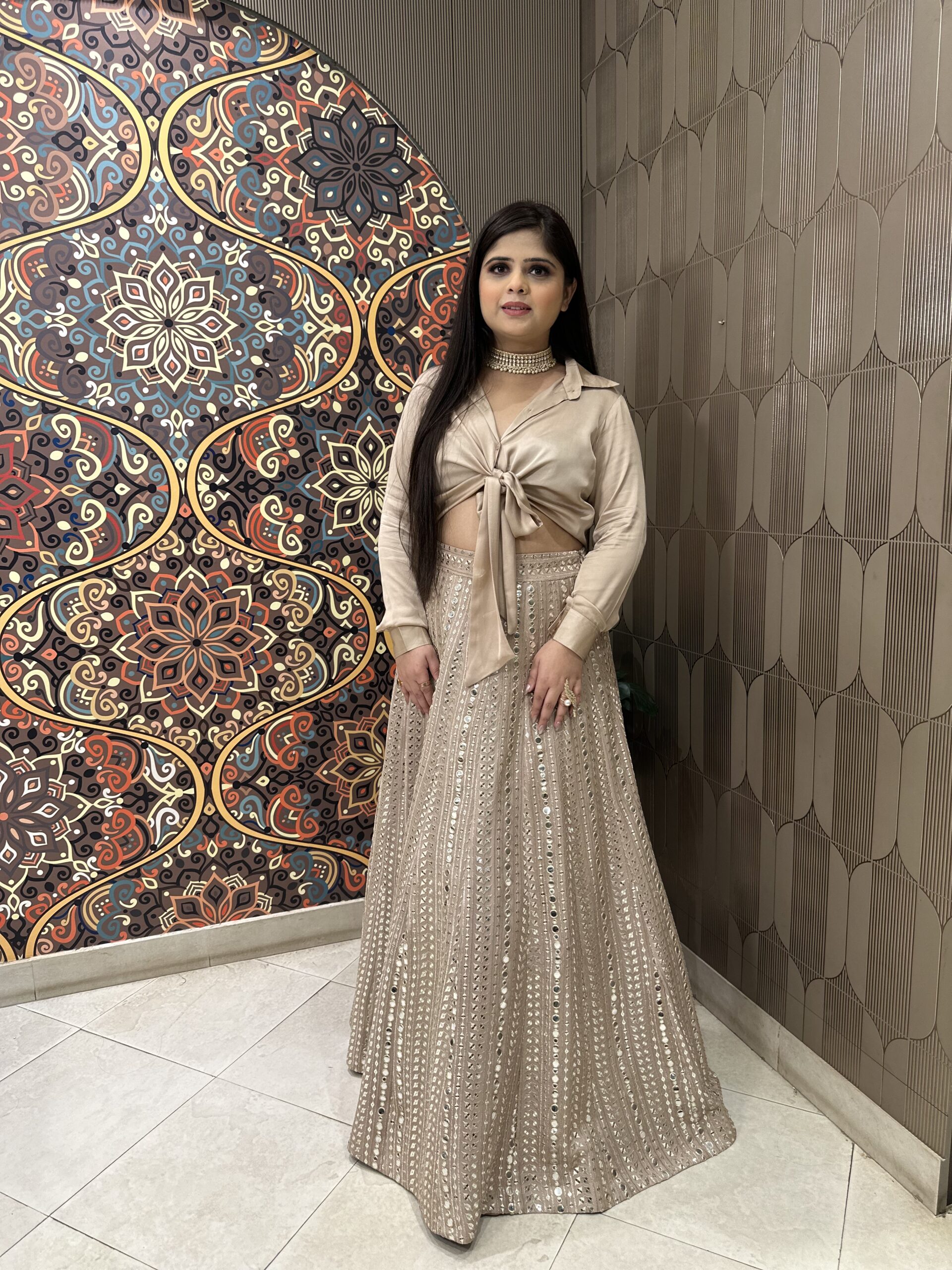The satin crop shirt with a mirror work skirt