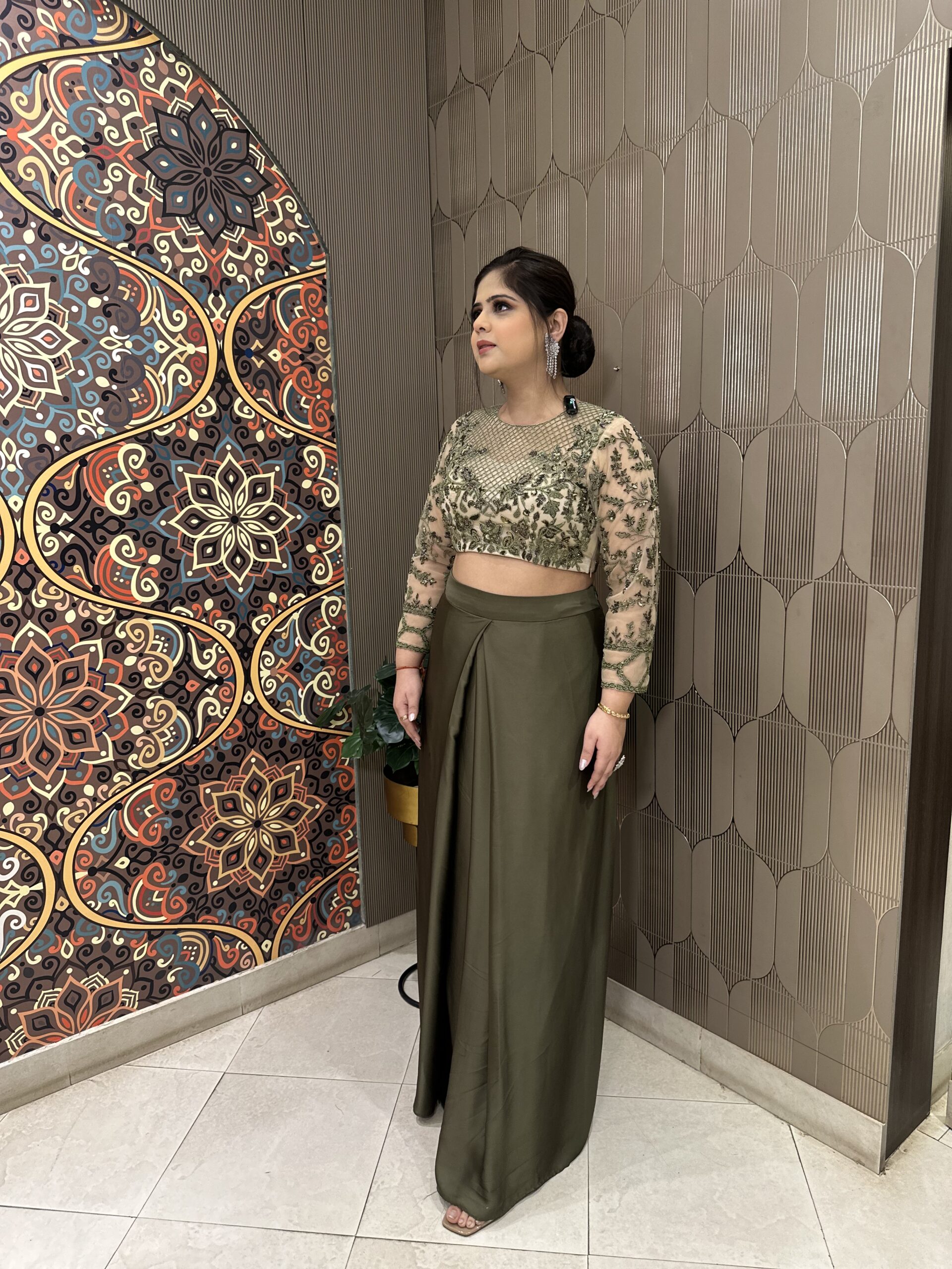 Olive Green Drape Skirt and emboroidered Bustier Blouse